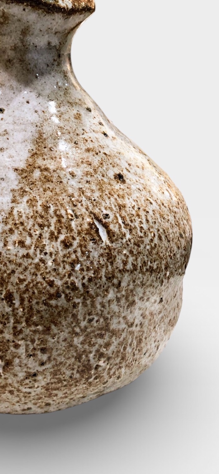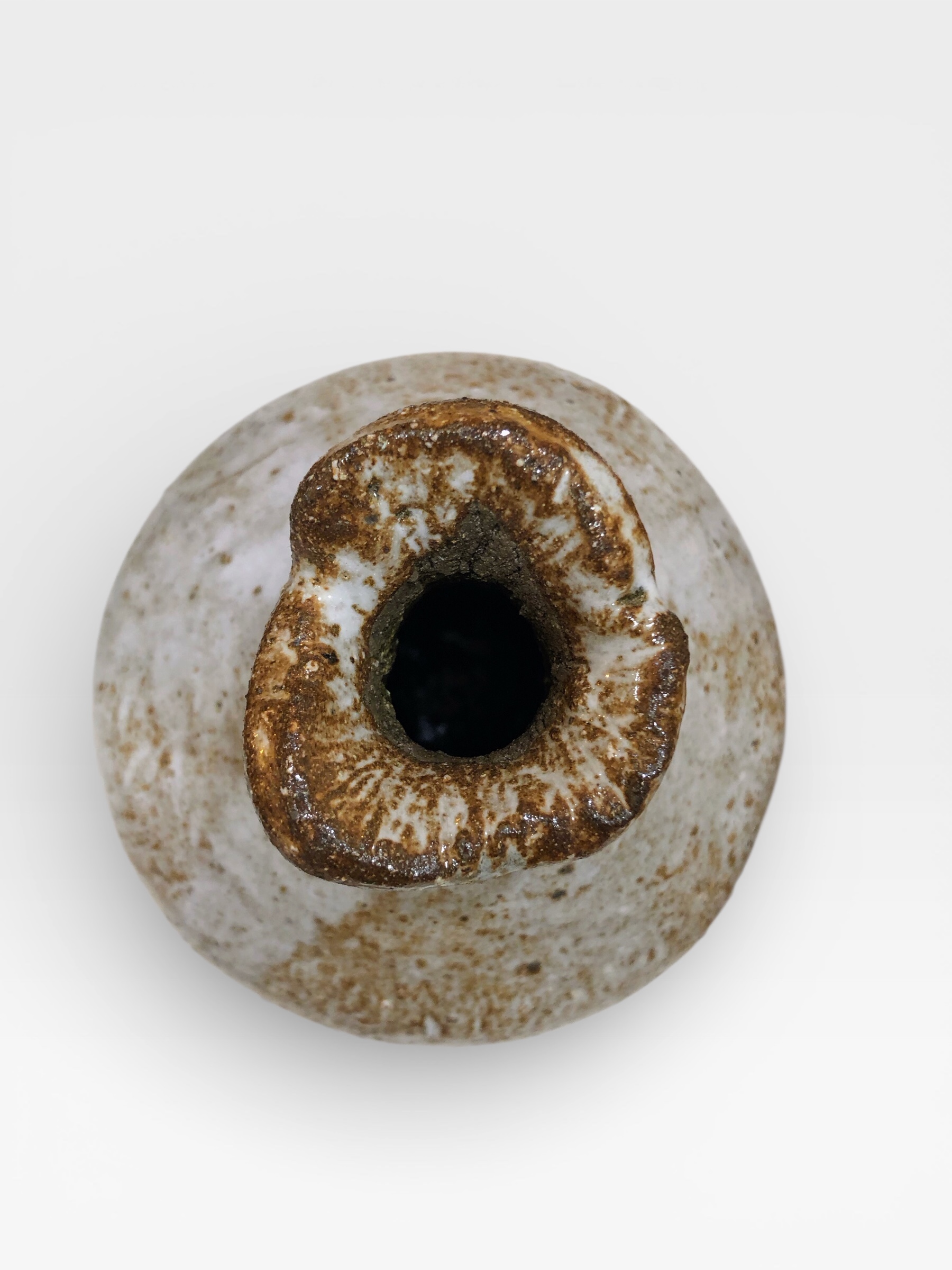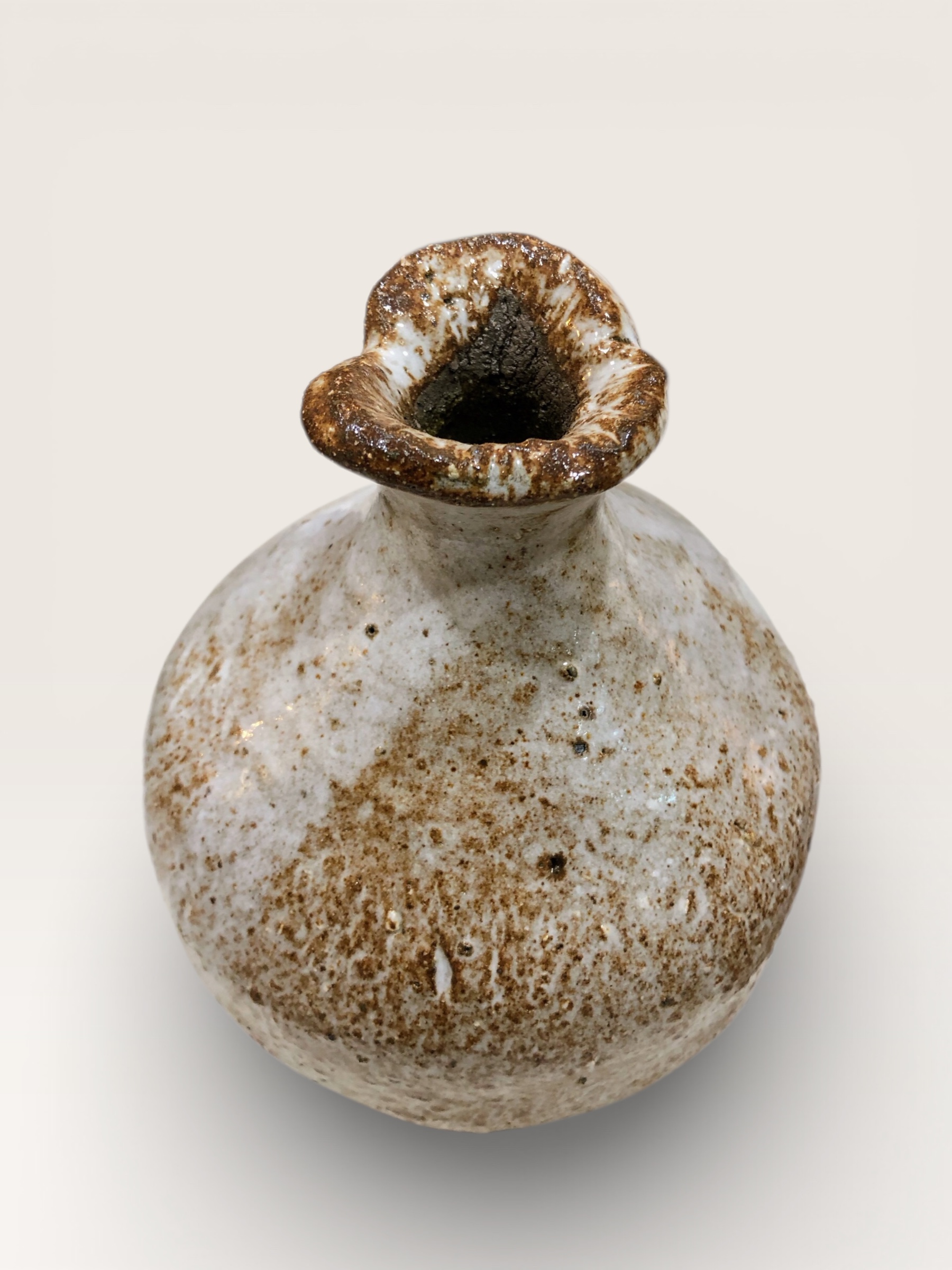 La superficie muestra un diálogo natural entre esmaltes artesanos en tonos crudos y tierras, con salpicaduras y matices que refuerzan su carácter único. Su forma redondeada y su boca ligeramente abierta lo convierten en un jarroncito delicado, ideal para flores, una ramita o simplemente como objeto escultórico.