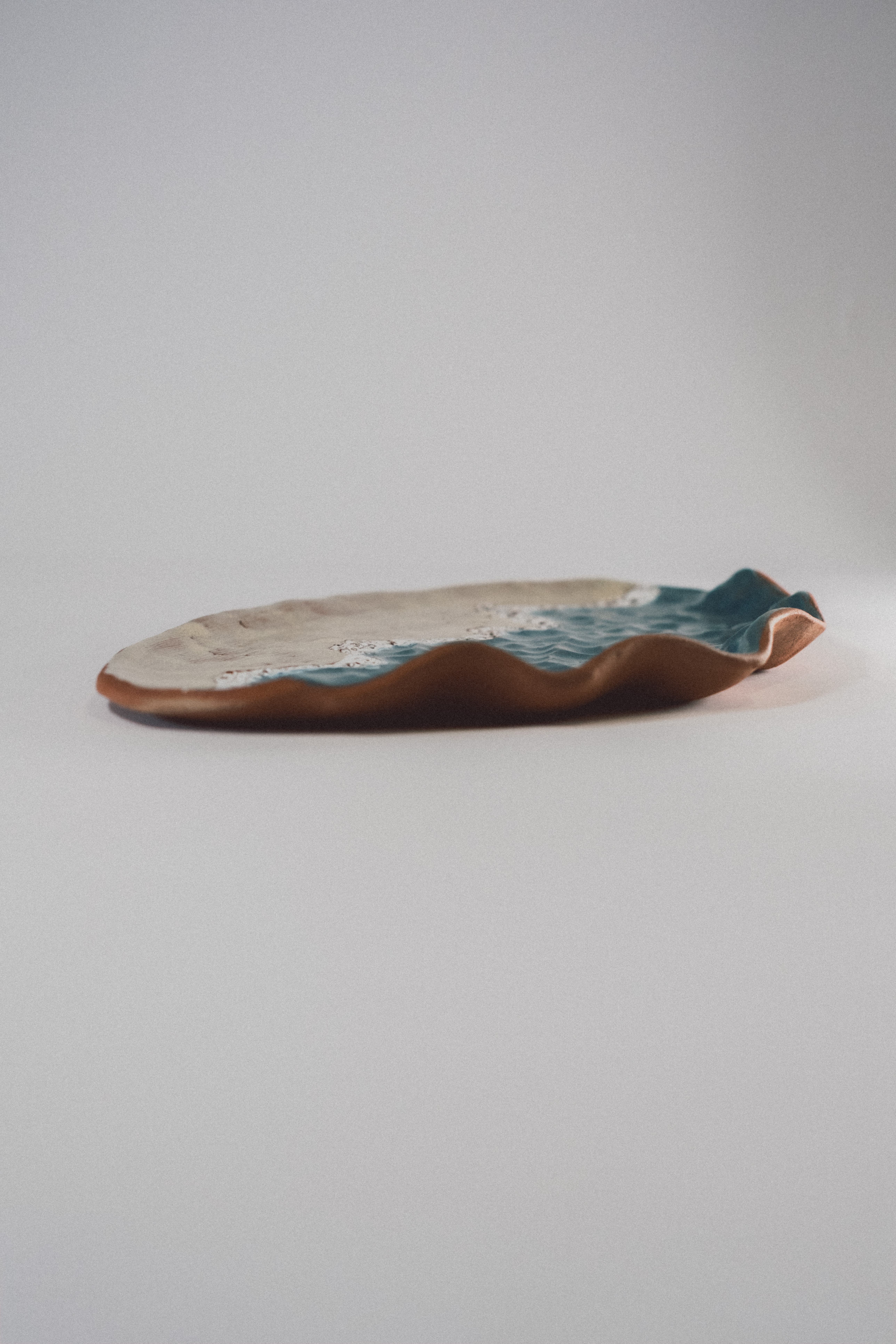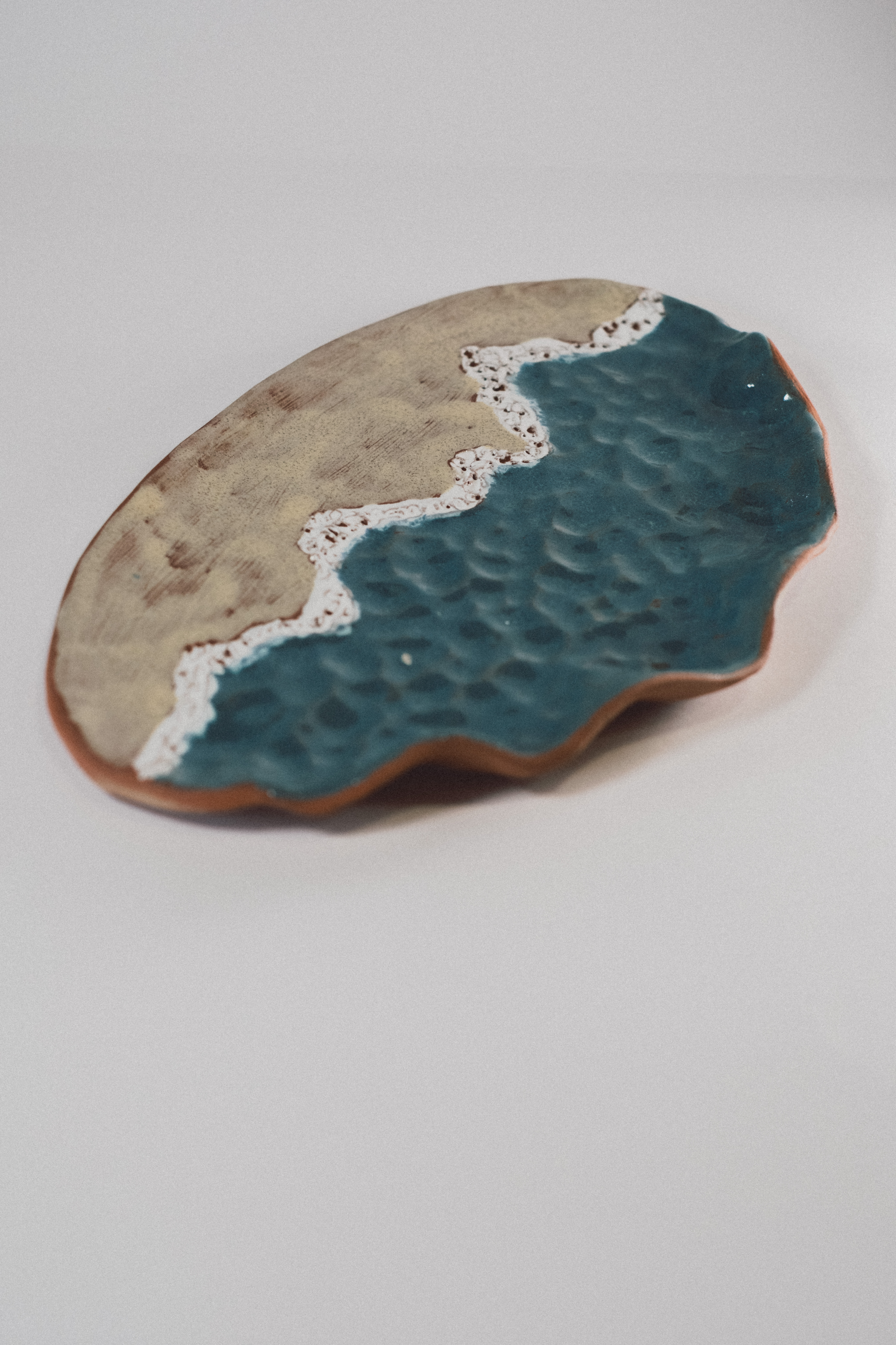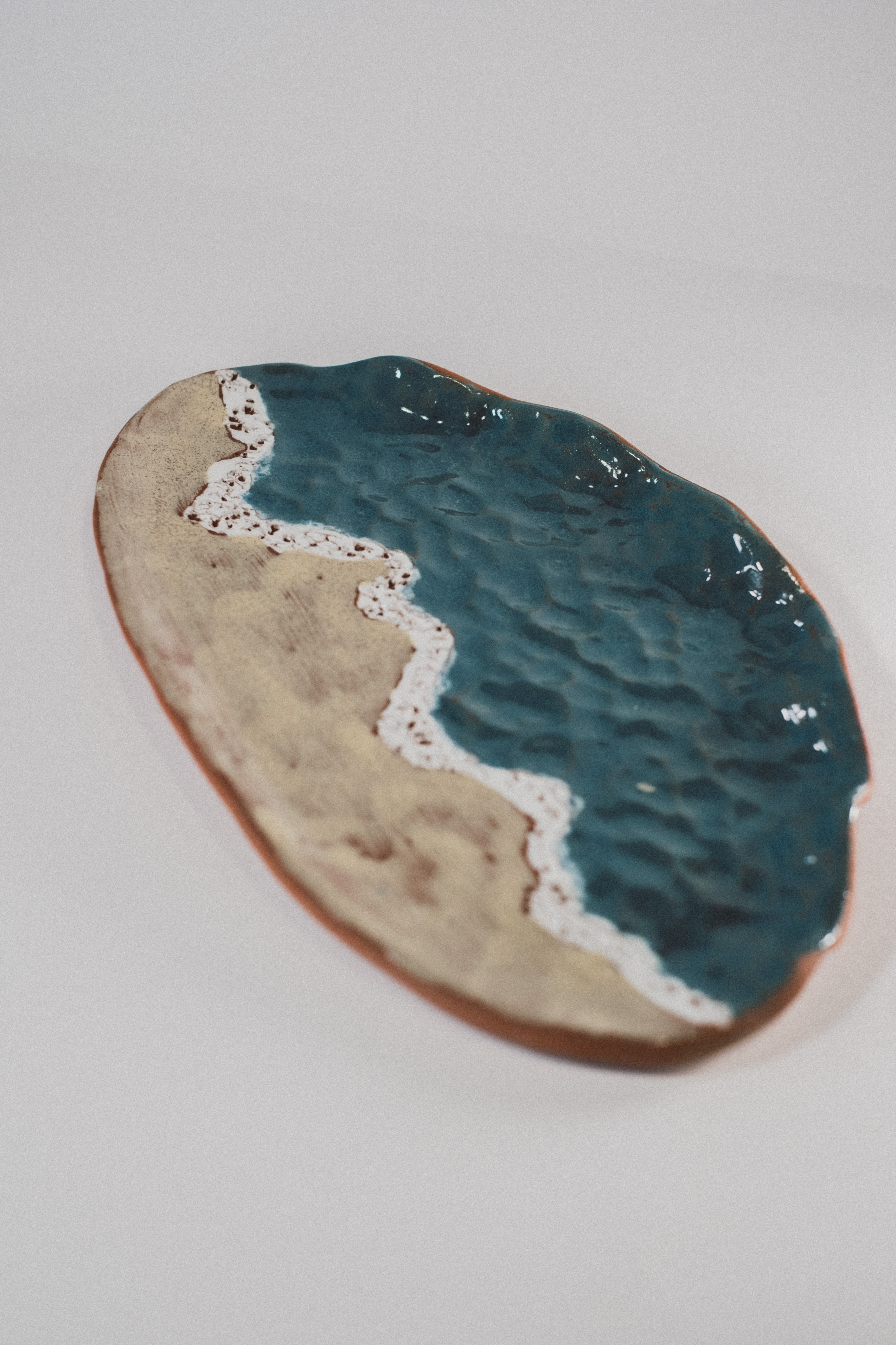 Bandeja Playa es una pieza hecha a mano que evoca el encuentro entre el mar y la arena, esmaltada a pincel con esmaltes artesanos.