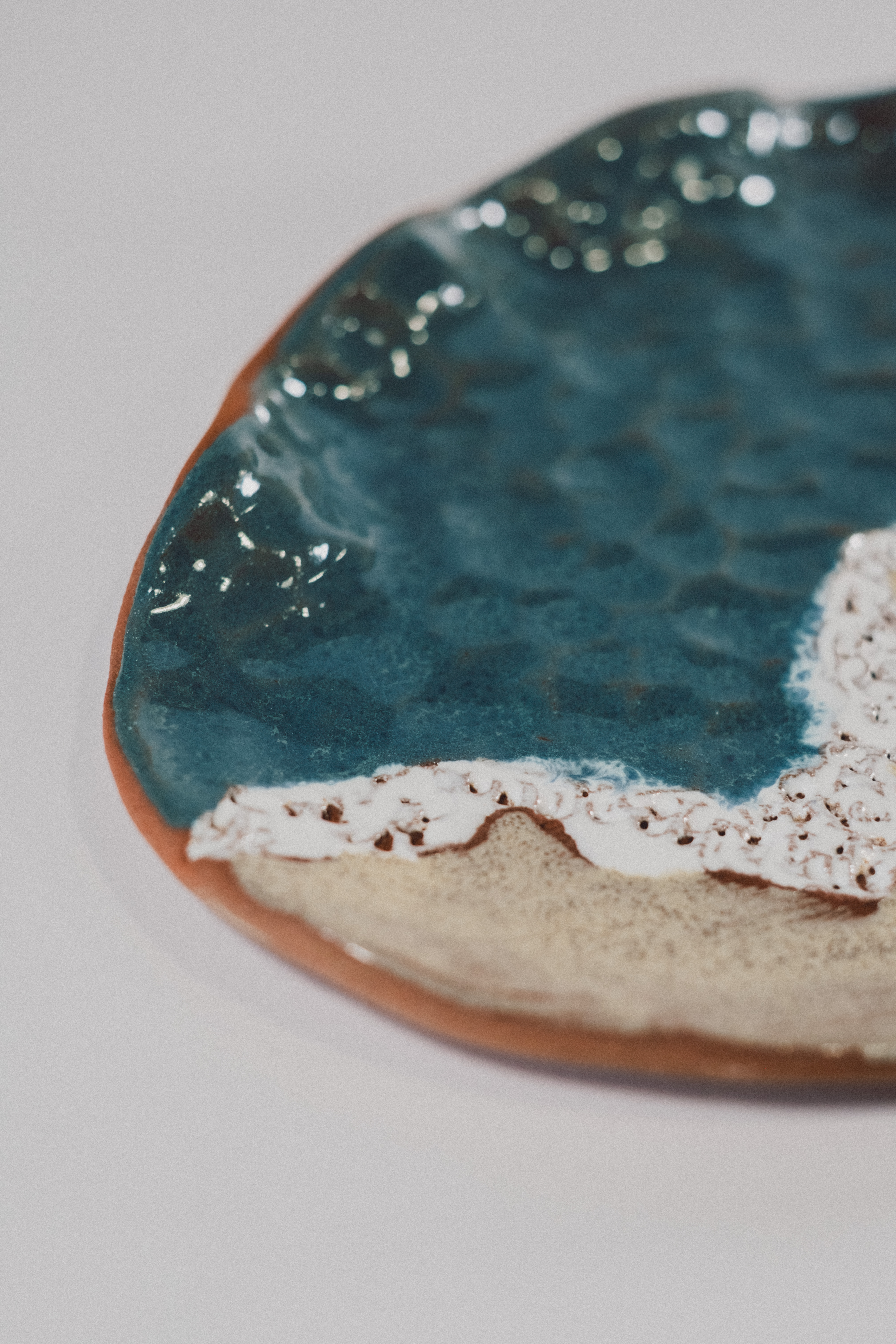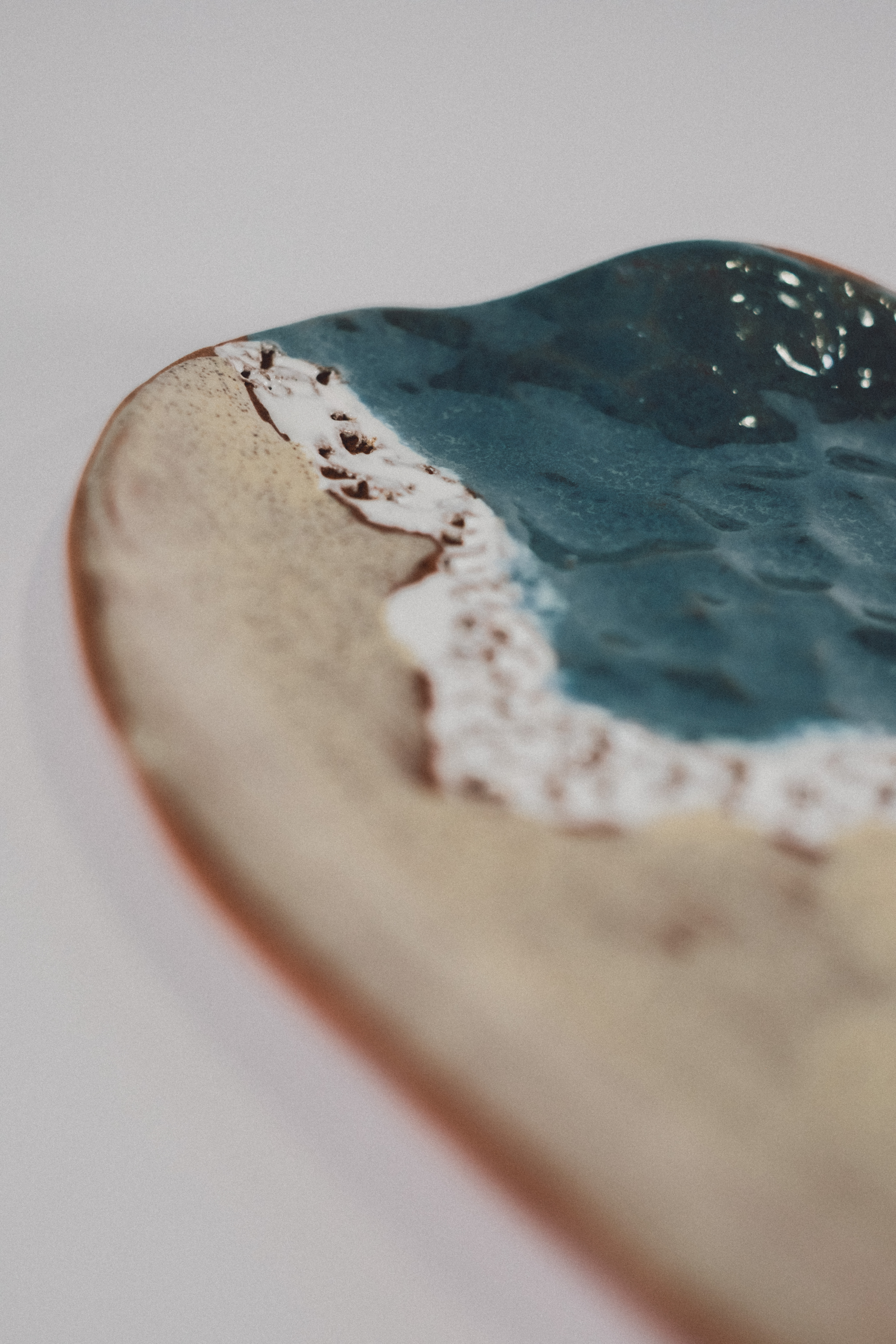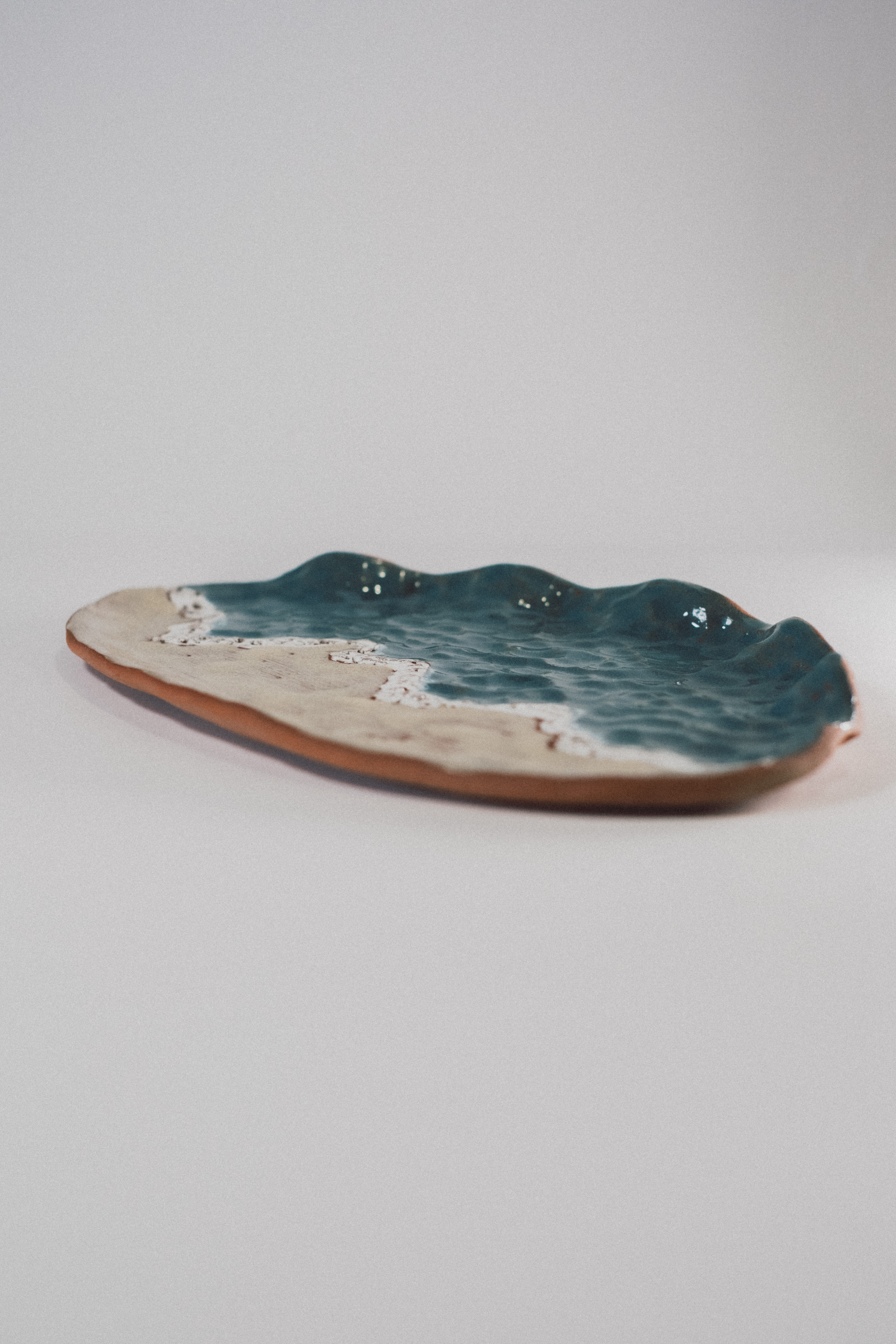 Bandeja Playa es una pieza hecha a mano que evoca el encuentro entre el mar y la arena, esmaltada a pincel con esmaltes artesanos.