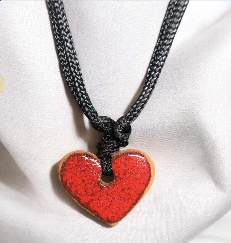 Colgante de cerámica en forma de corazón, esmaltado en rojo brillante a mano.