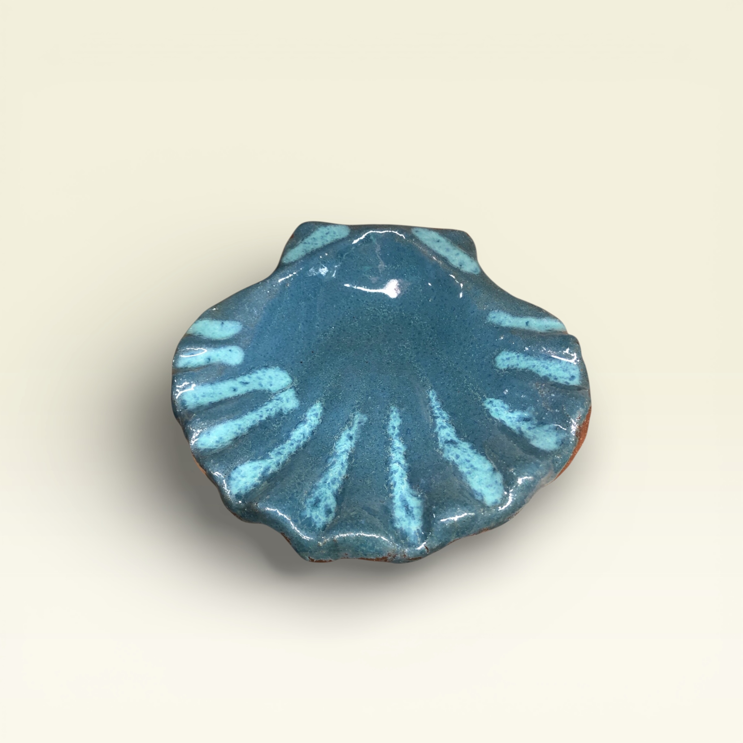 a mano, con forma orgánica inspirada en las conchas marinas. Esmaltada en tonos azules y turquesa, con texturas que evocan el movimiento del mar. Cada pieza es única, con variaciones propias del trabajo artesanal. Ideal como pequeño plato decorativo o para joyas, llaves o velas.