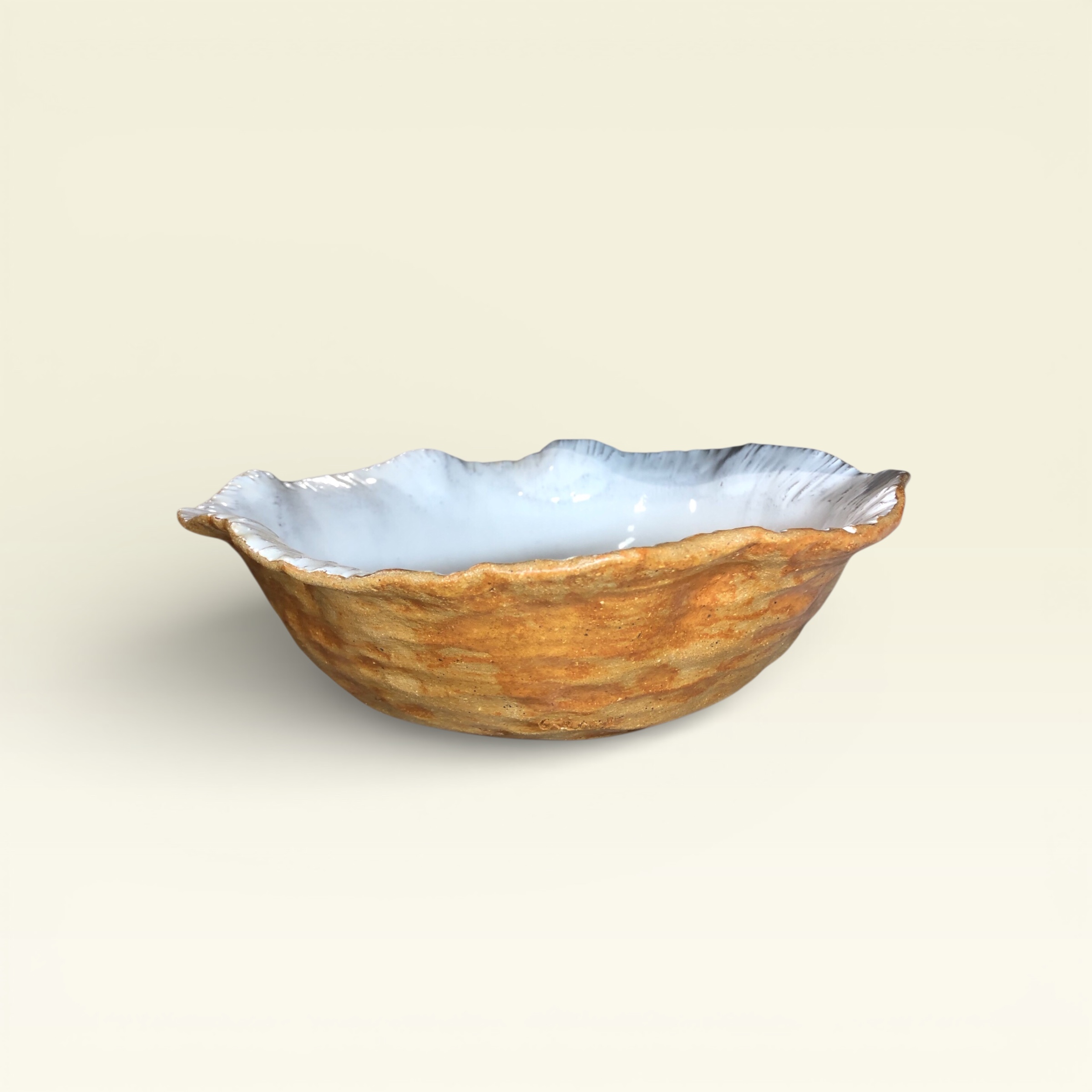 Cuenco grande de cerámica modelado a mano, con un contorno ondulado y texturas. El esmalte interior blanco brillante contrasta con una piel exterior de textura viva y tonos terrosos y anaranjados.