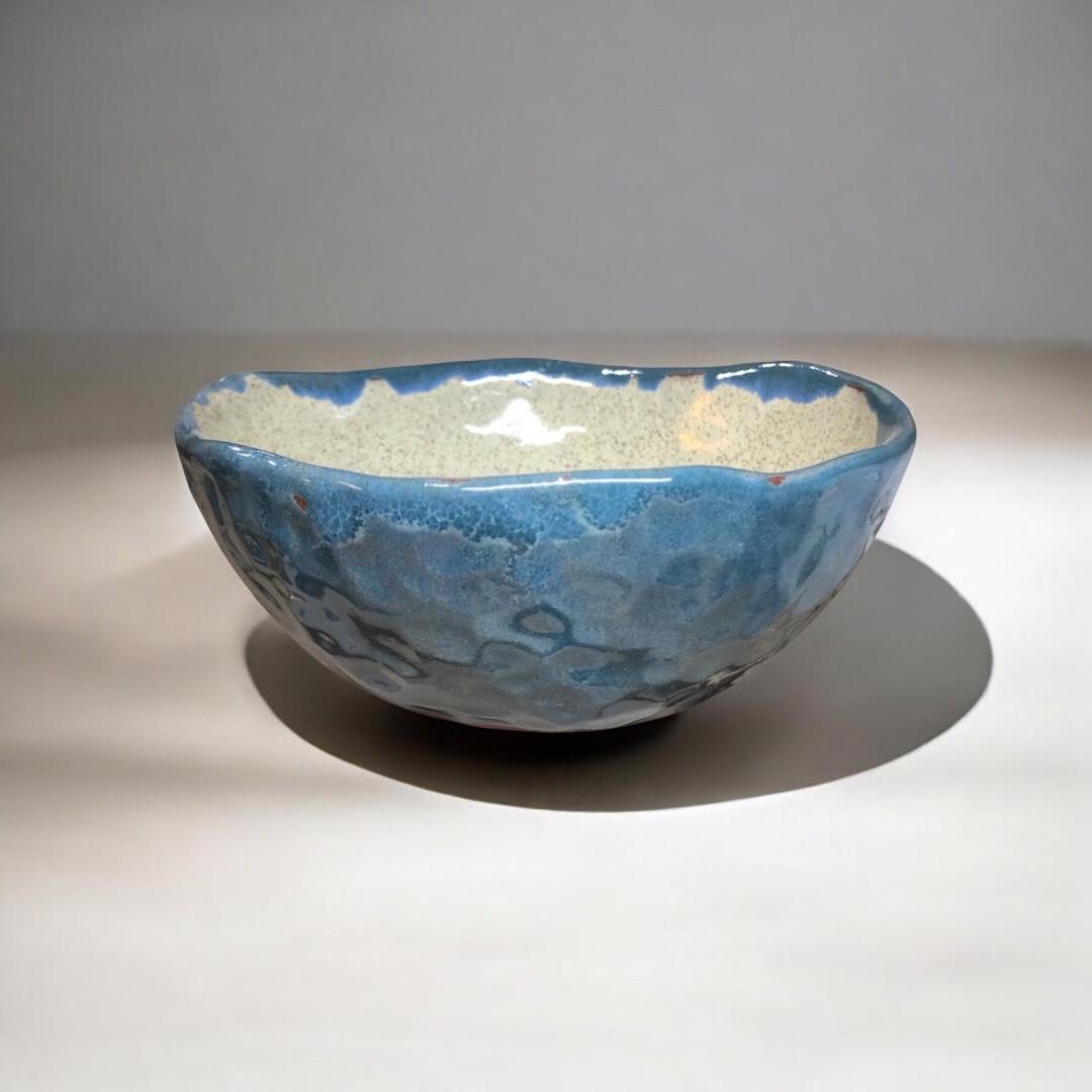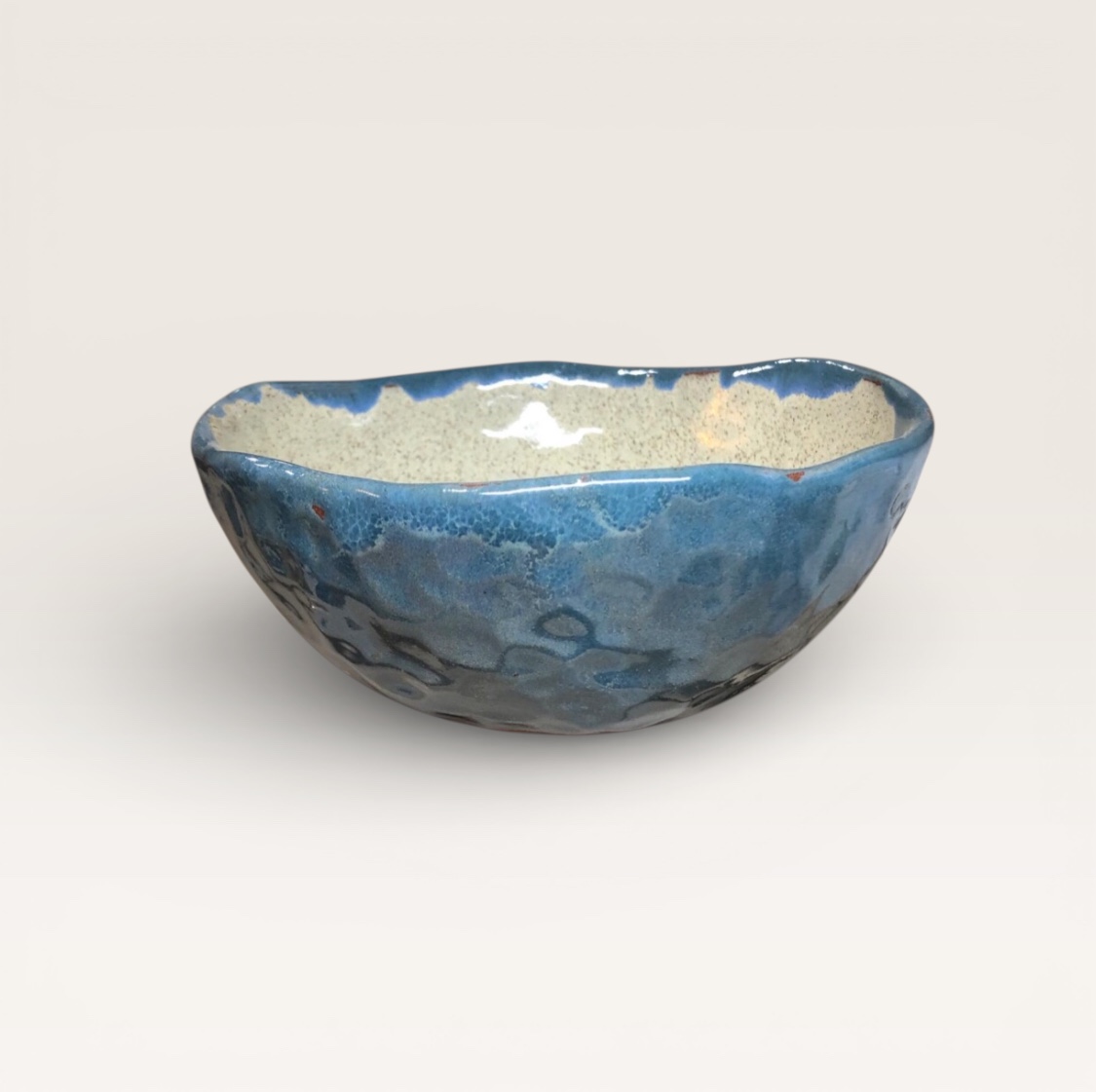 Cuenco de cerámica modelado a mano con barro de Buño. El interior está esmaltado en color crema y el exterior en azul cobalto con texturas evocando los colores de la arena y el mar.