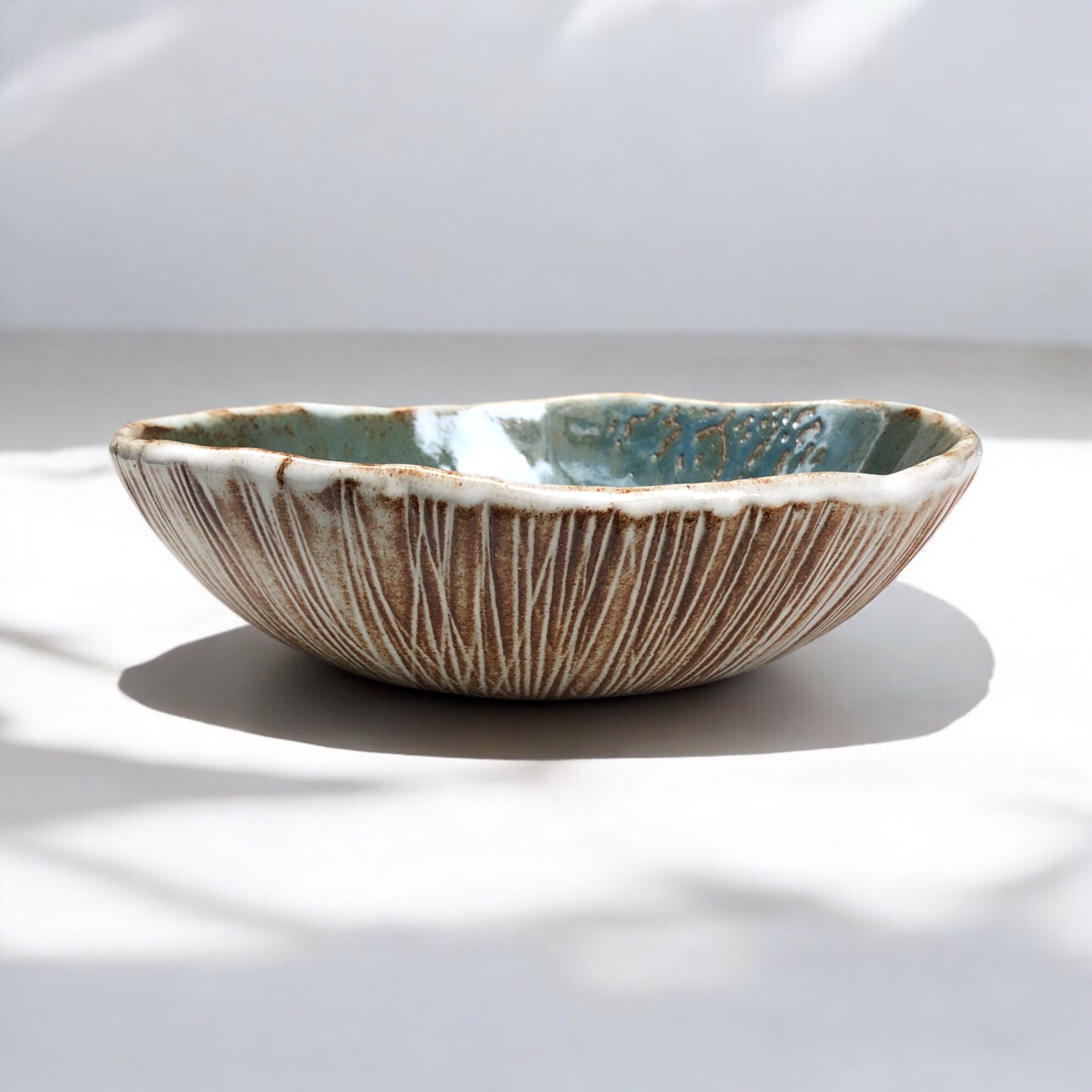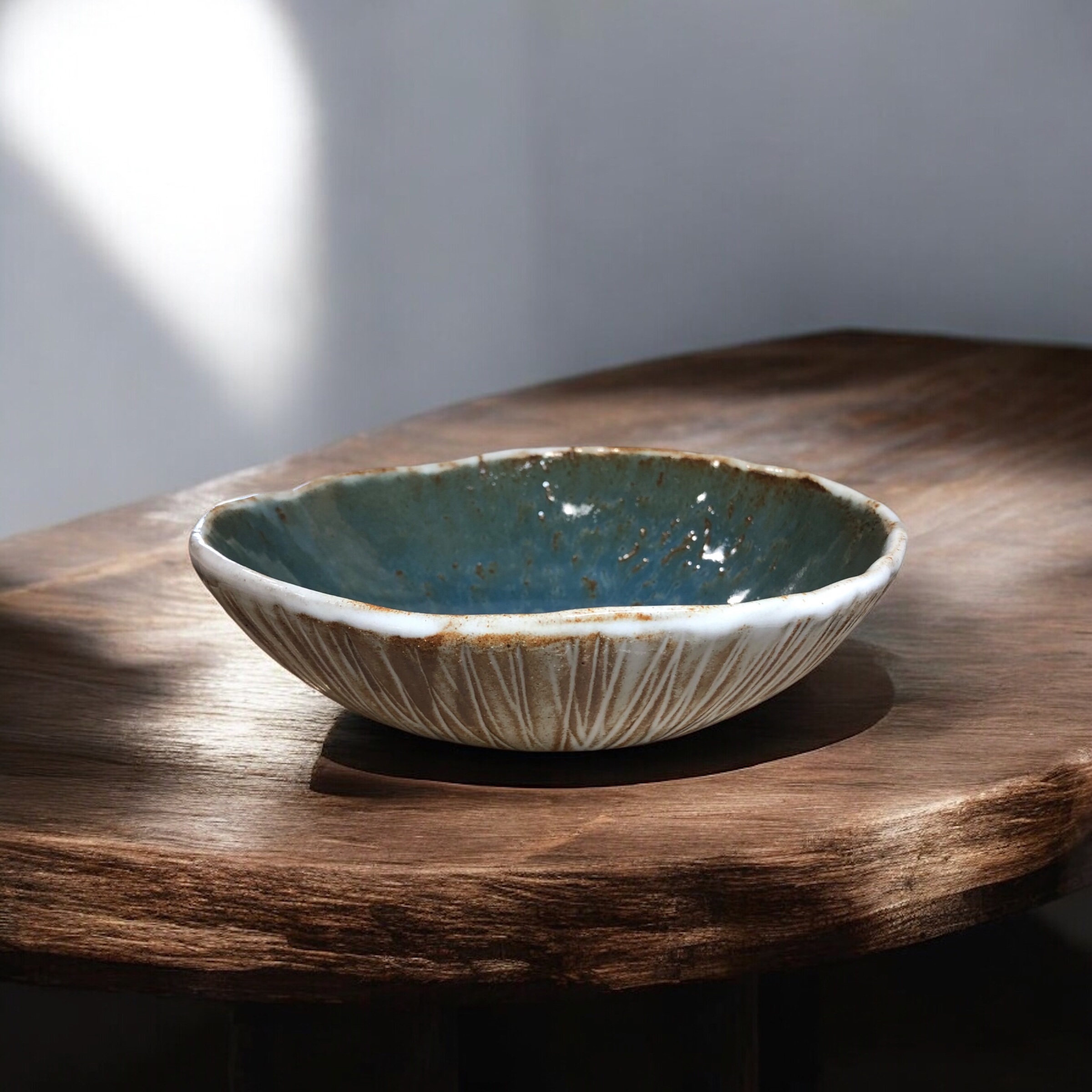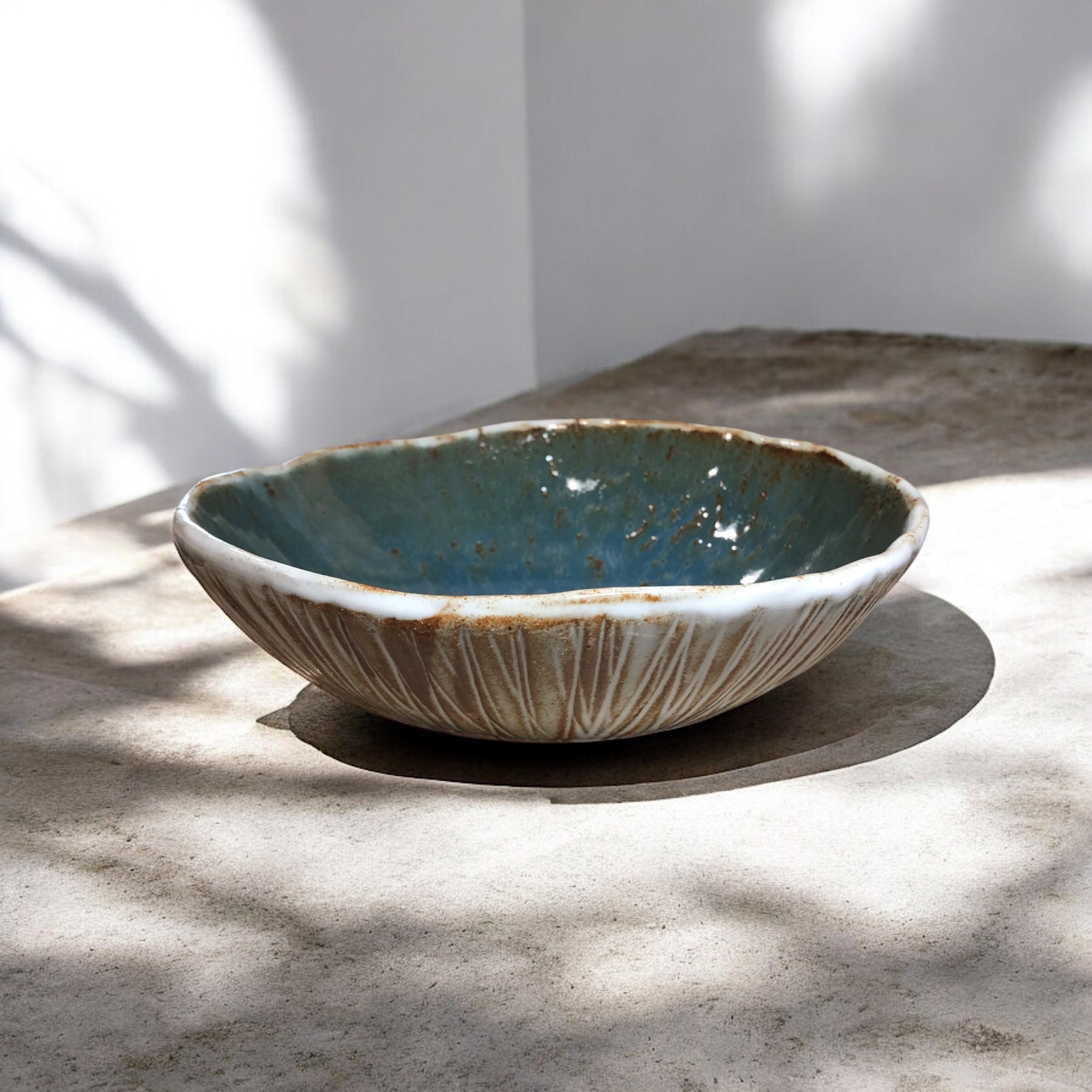 Cuenco de cerámica hecho a mano y cocido a alta temperatura, con un diámetro de 21 cm aproximado y una altura de 5,5 cm. Su forma abierta lo convierte en una pieza muy versátil que puede utilizarse tanto como cuenco amplio como plato hondo, ideal para acompañar platos llanos en una mesa especial. El interior está esmaltado en un azul intenso y profundo, con matices y pequeñas variaciones que aparecen durante la cocción y que hacen que cada pieza sea única. El esmalte crea una superficie brillante y rica en textura visual. El exterior presenta un esmalte blanco roto con matices óxido, donde una delicada textura radial tallada a mano deja ver tonos cálidos que recuerdan a la tierra y al hierro. Esta combinación entre el azul del interior y los tonos orgánicos del exterior aporta equilibrio entre frescura y calidez. Cada cuenco es una pieza única, modelada y acabada artesanalmente, por lo que puede presentar ligeras variaciones que forman parte de su belleza y autenticidad. Perfecto para servir ensaladas, pasta, cremas, frutas o platos principales, o como pieza especial dentro de una vajilla artesanal