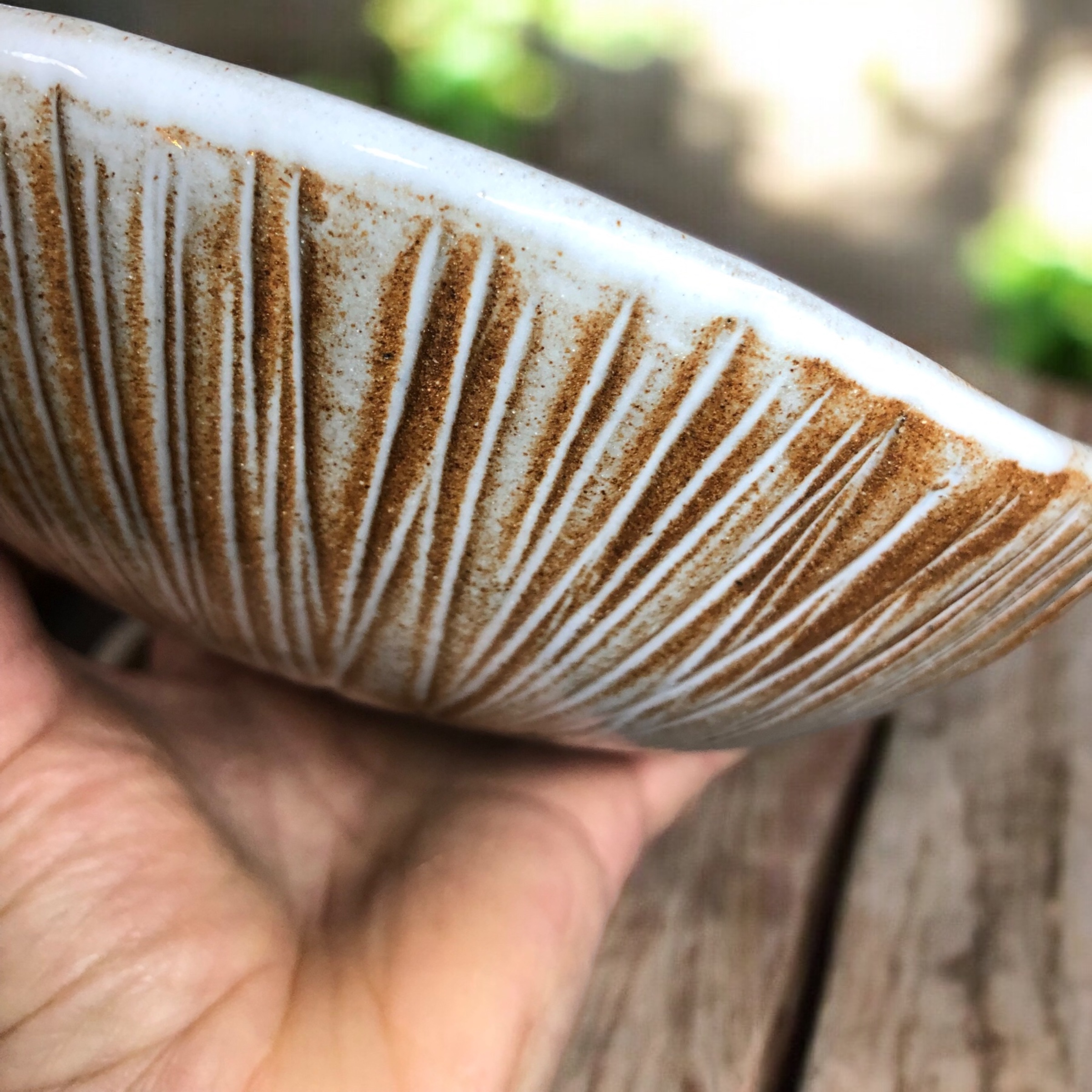 El exterior presenta un esmalte blanco roto con matices óxido, donde una delicada textura radial tallada a mano deja ver tonos cálidos que recuerdan a la tierra y al hierro. Esta combinación entre el azul del interior y los tonos orgánicos del exterior aporta equilibrio entre frescura y calidez.