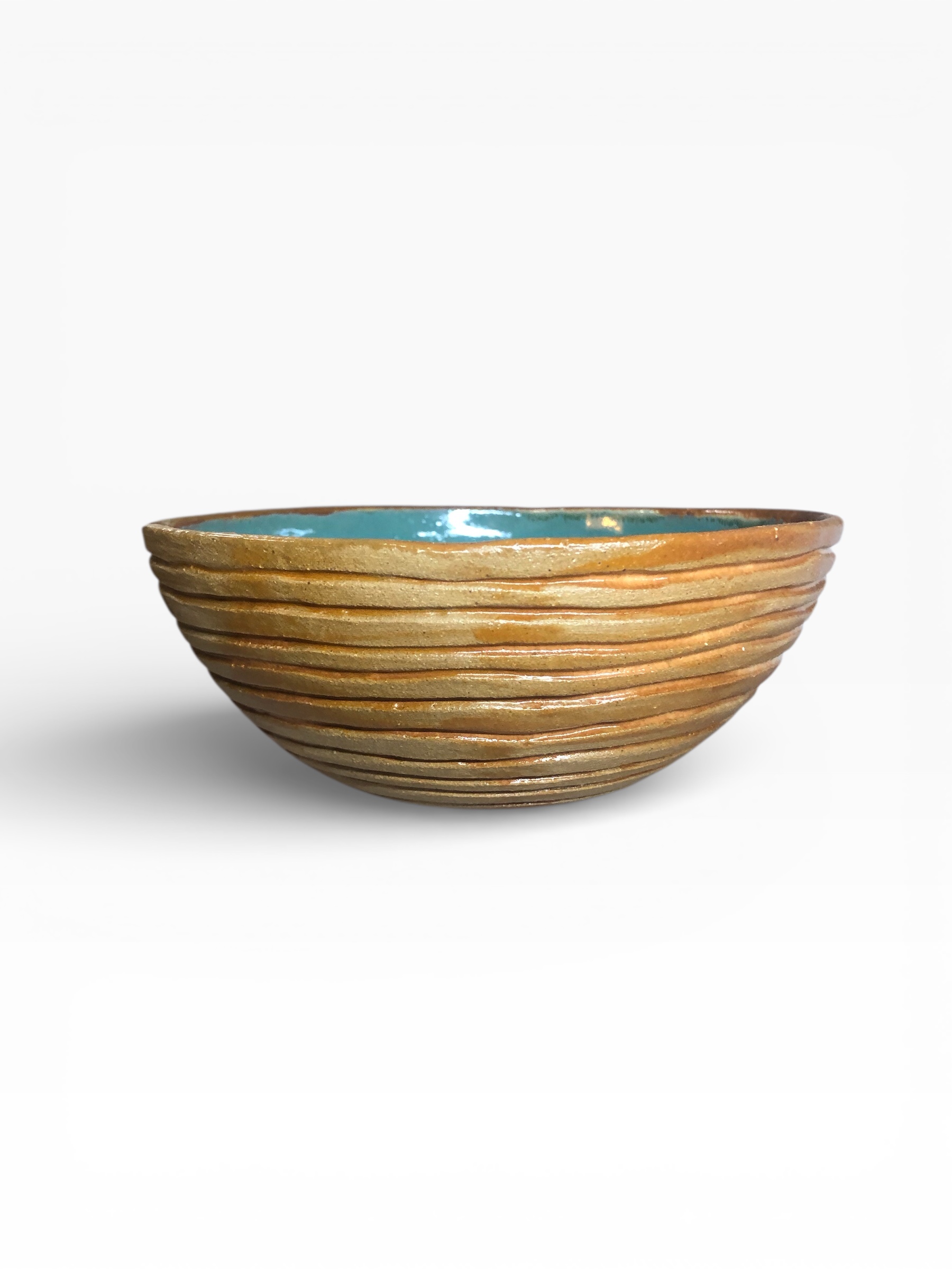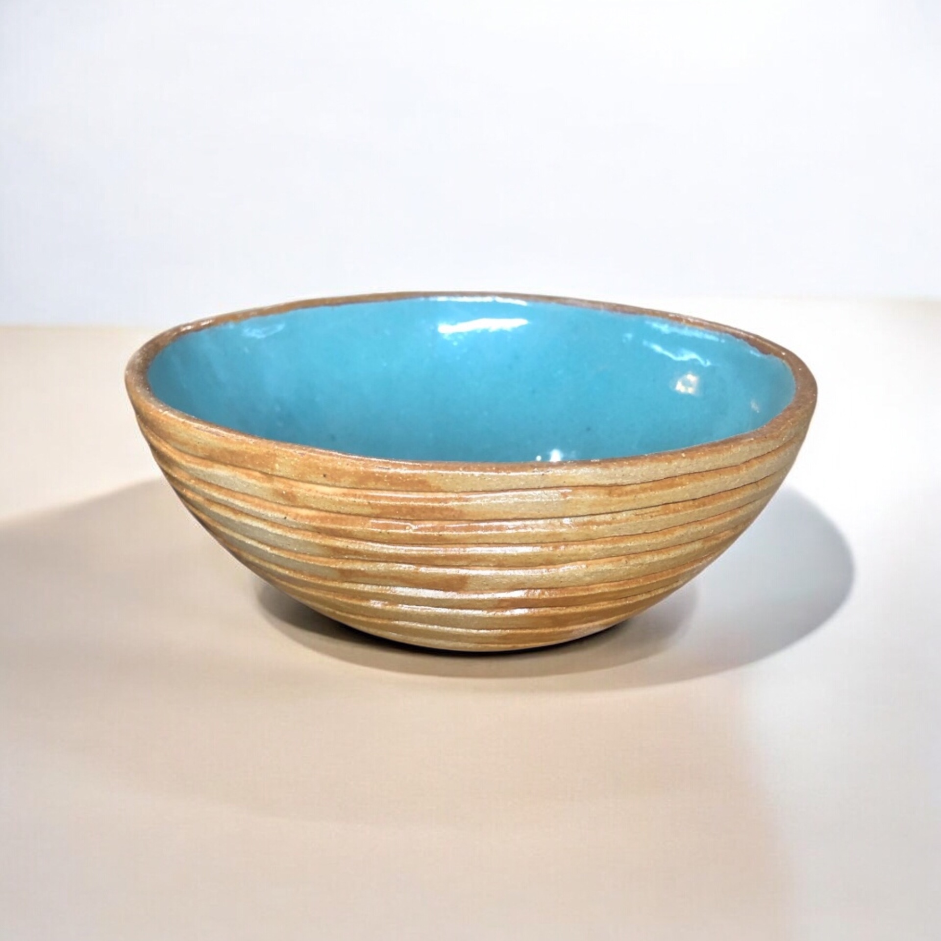 Cuenco de cerámica modelado a mano. El exterior presenta un acabado en tono tierra cálido ,con delicadas líneas horizontales que recorren toda la superficie y aportan textura, ritmo visual y una sensación muy natural al tacto. El interior esta esmaltado en azul turquesa luminoso y profundo, que contrasta de forma elegante con el tono natural del exterior. Este juego de colores recuerda al encuentro entre la tierra y el cielo, aportando frescura y serenidad a la pieza. Su tamaño lo hace perfecto para múltiples usos: servir ensaladas individuales, fruta, yogur, cereales, aperitivos o pequeños platos. También puede utilizarse como elemento decorativo en una mesa o estantería. Cada cuenco es único, con pequeñas variaciones propias del proceso artesanal que lo convierten en una pieza irrepetible.
