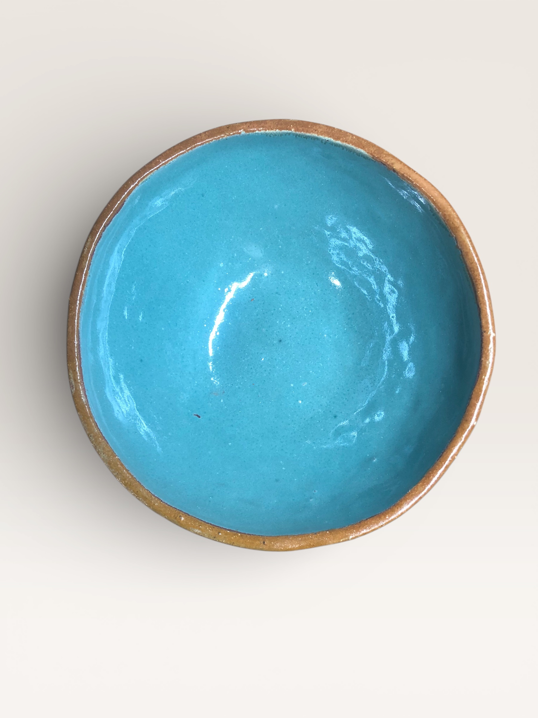 Cuenco de cerámica artesanal con interior azul turquesa.