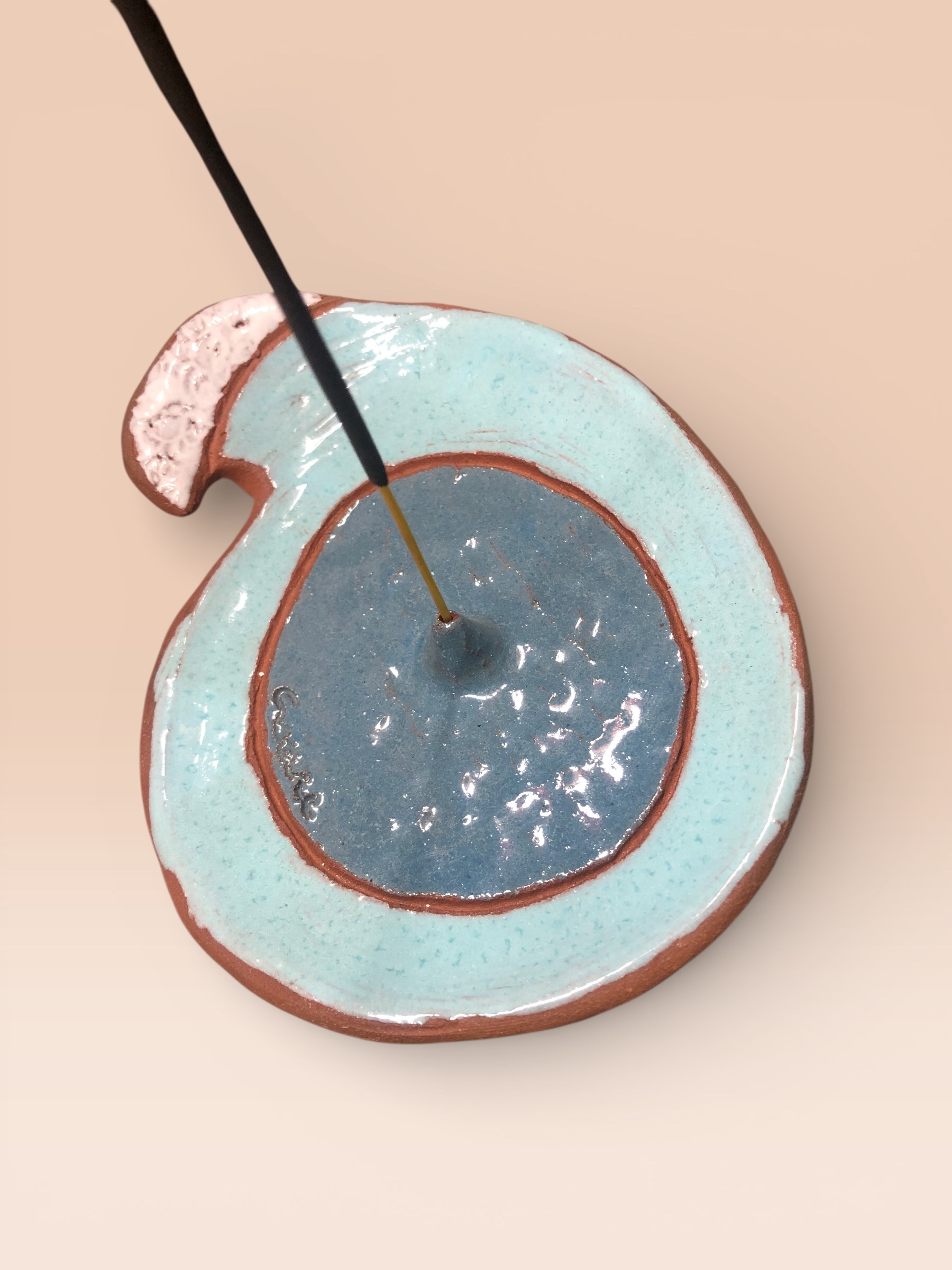Ola es un incensario artesanal modelado a mano, con una forma fluida que evoca el movimiento natural del mar. Está esmaltado a pincel con esmaltes artesanales, creando matices únicos en cada pieza.