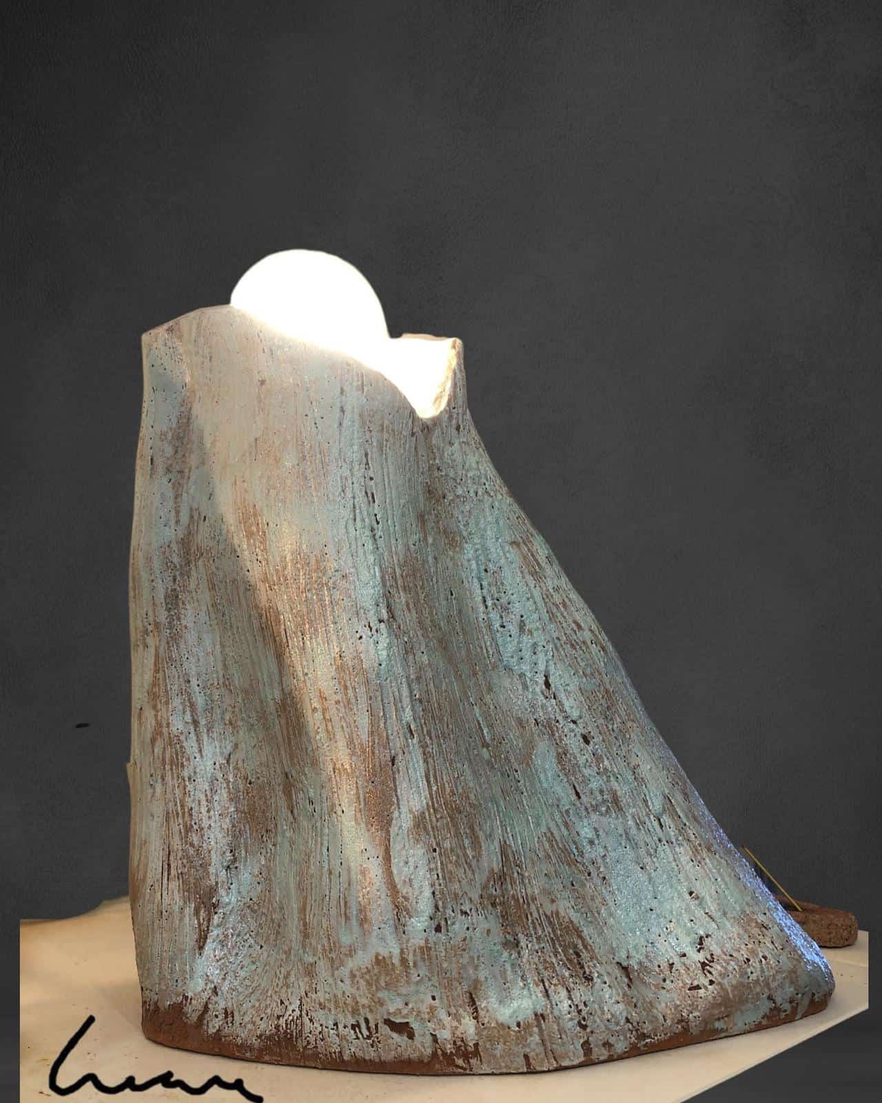 Lámpara escultórica de mesa modelada a mano, con dos cocciones. Coloreada a pincel con esmaltes de formulación propia. Inspirada en la naturaleza.