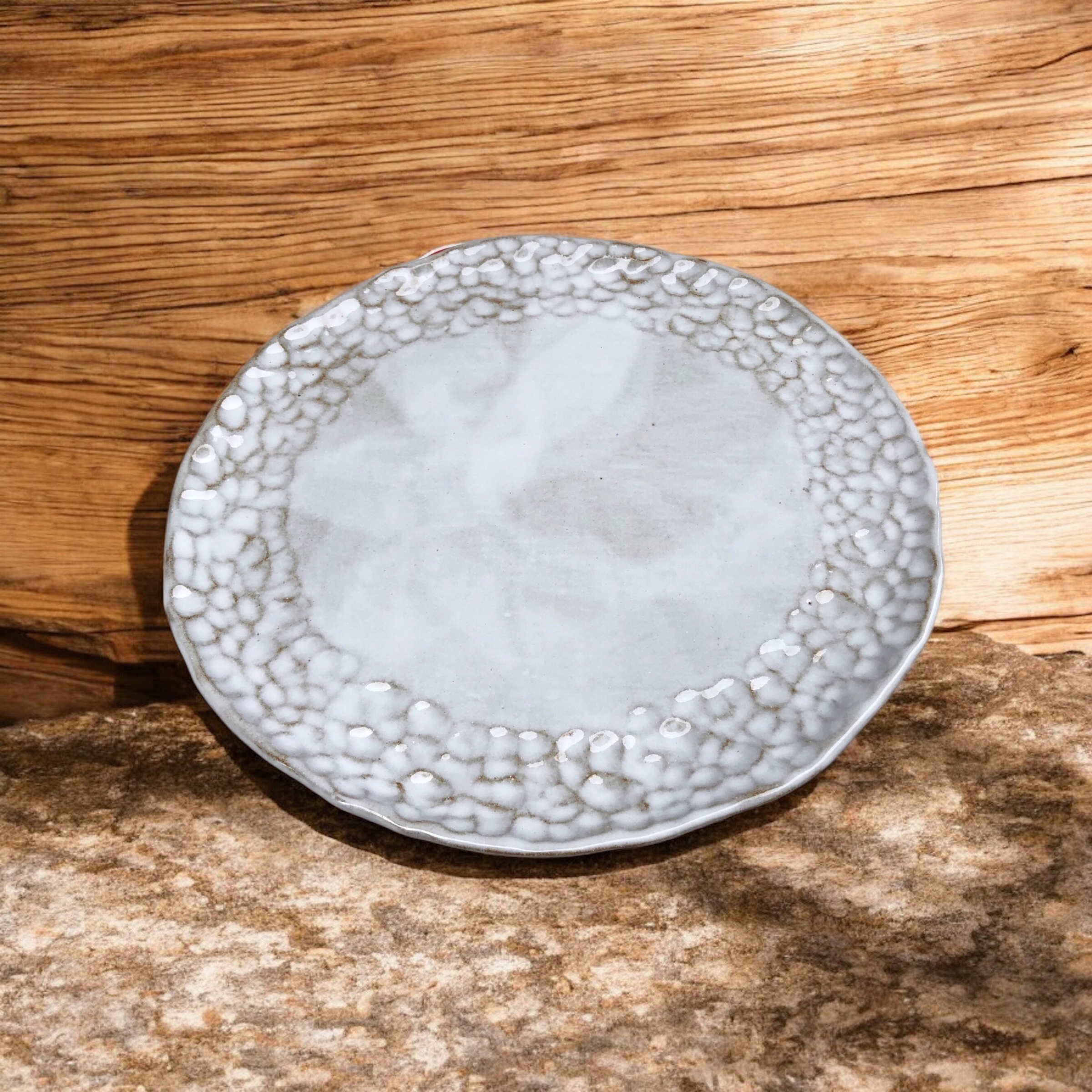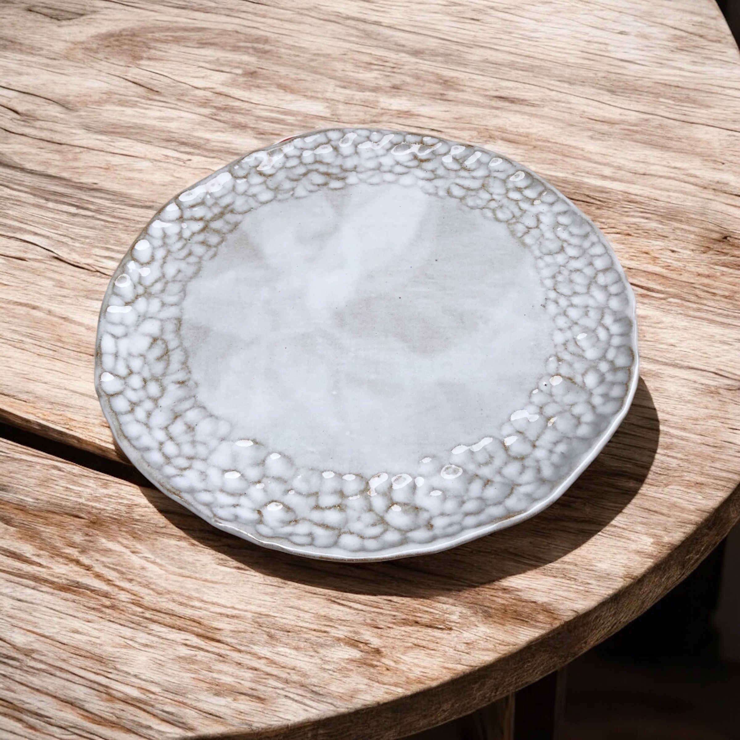 El plato llano Espuma de Mar es un plato hecho a mano de 25 cm de diámetro y cocido en alta temperatura, otorgándole la mayor resistencia y durabilidad. La superficie central presenta un esmalte blanco suave y luminoso, de acabado ligeramente matizado que aporta serenidad visual y permite que los alimentos destaquen con elegancia. El borde del plato es el verdadero protagonista: está decorado con una textura orgánica en relieve , hecha a mano una a una recordándonos a la espuma del mar. Este efecto crea un anillo texturizado y brillante que aporta profundidad, movimiento y un carácter muy especial a la pieza. Las ligeras variaciones del esmalte y del relieve hacen que cada plato sea único, reflejando el proceso artesanal y el comportamiento natural de los esmaltes a alta temperatura. Un plato pensado para quienes disfrutan de mesas con personalidad, piezas hechas a mano y estética contemporánea.