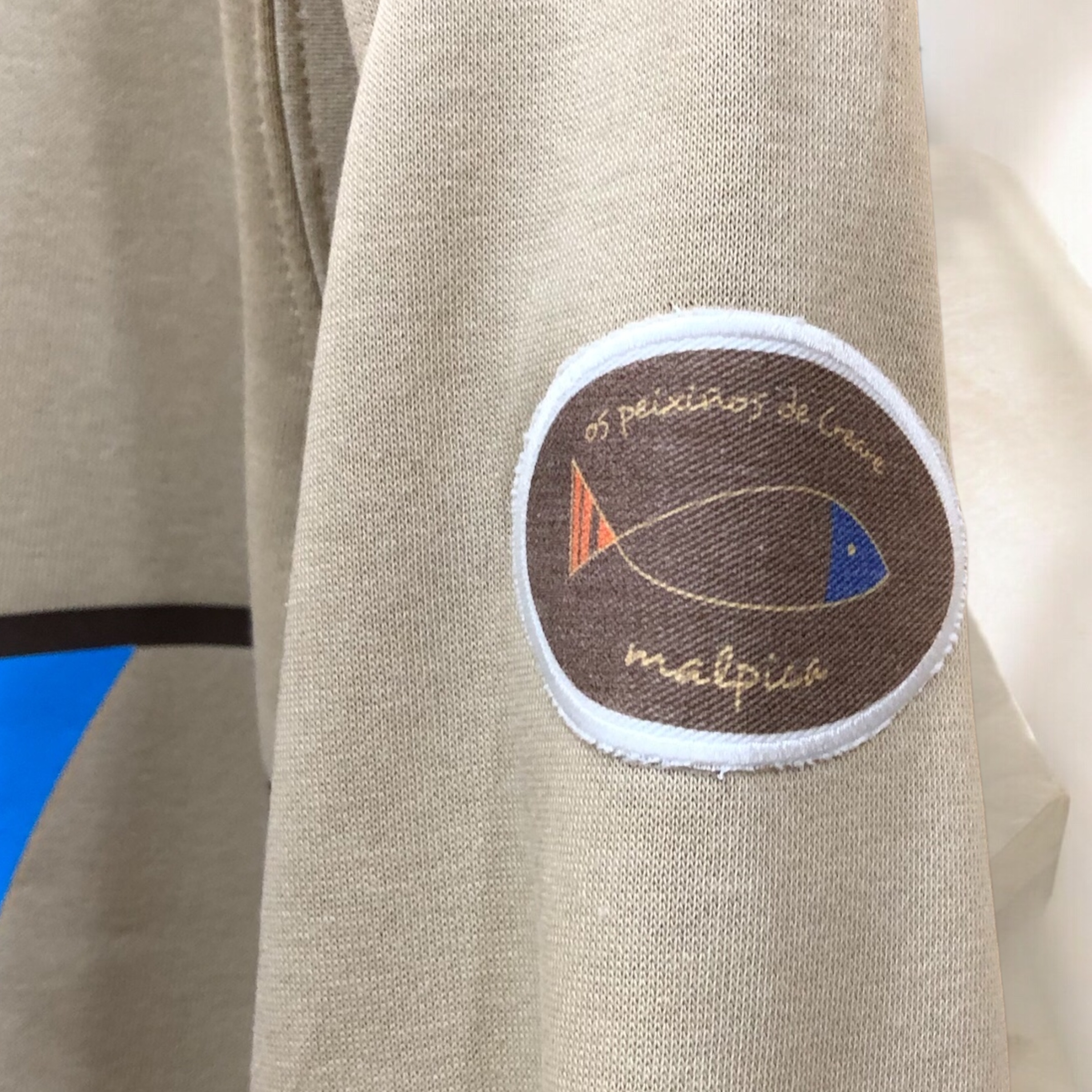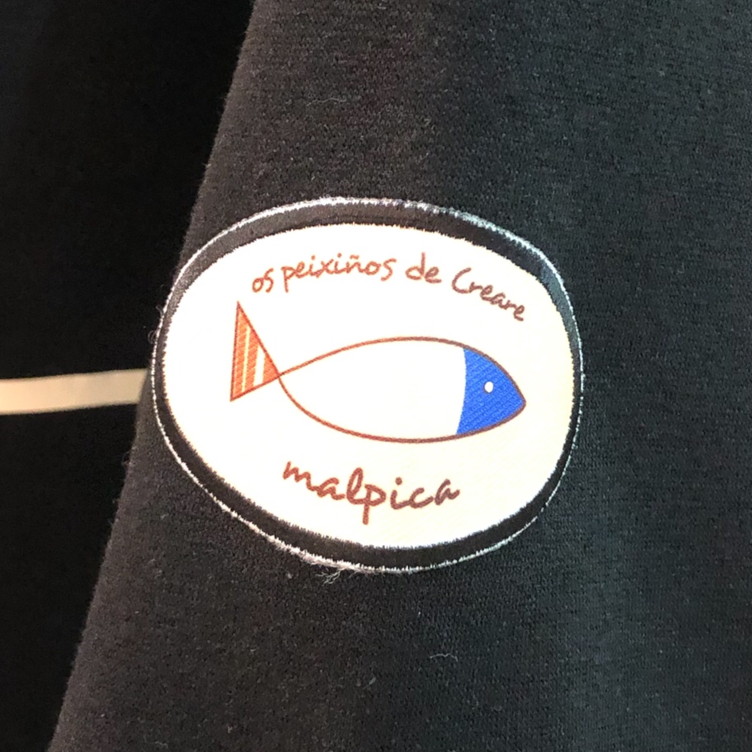 El diseño juega con la idea del pez dividido : en la parte delantera aparece medio pescado y en la espalda continua la cola, creando un conjunto sencillo pero muy expresivo. En la manga lleva un parche con la maca Os Peixiños de Creare, un pequeño detalle que refuerza su carácter artesanal y su vínculo con Malpica y la Costa da Morte.
