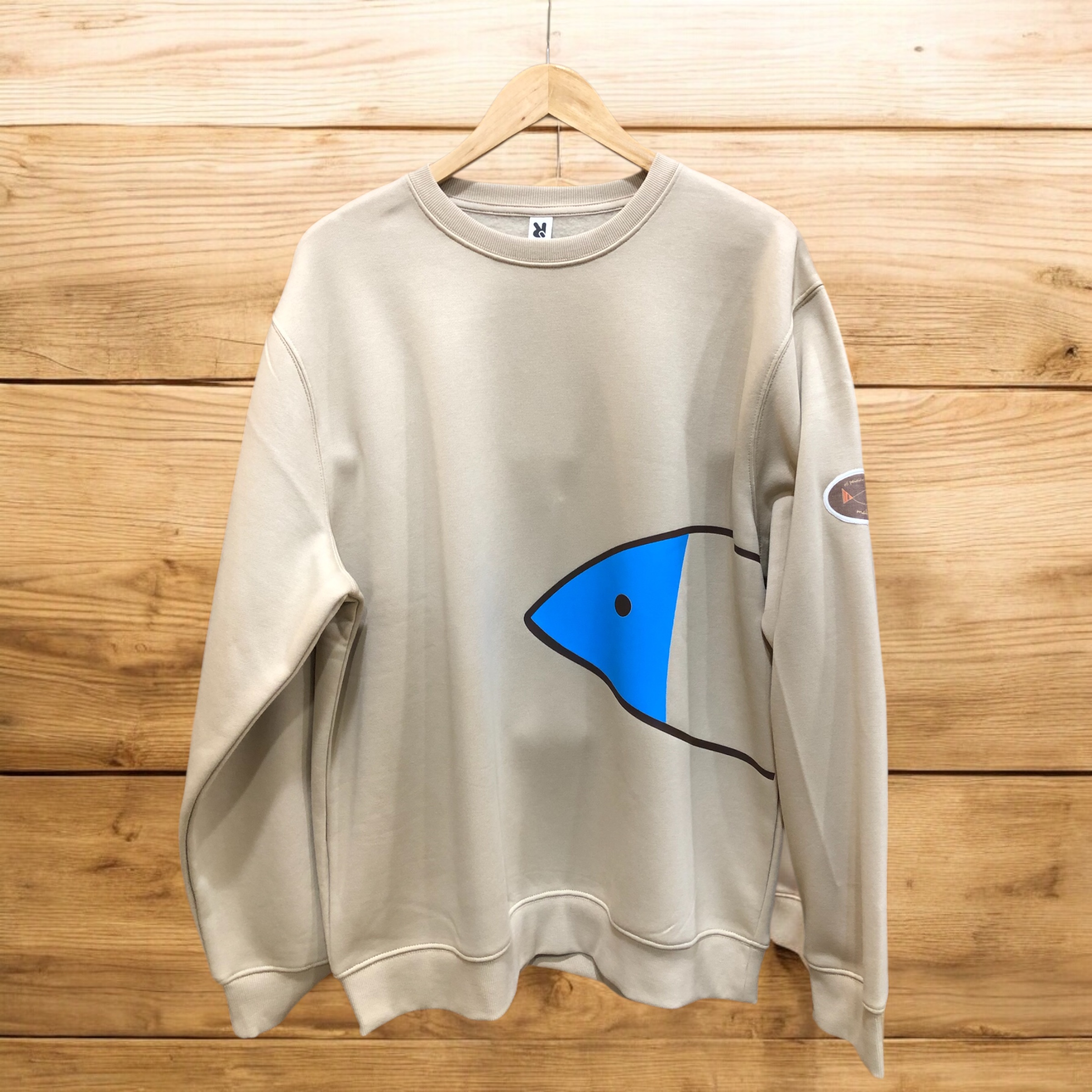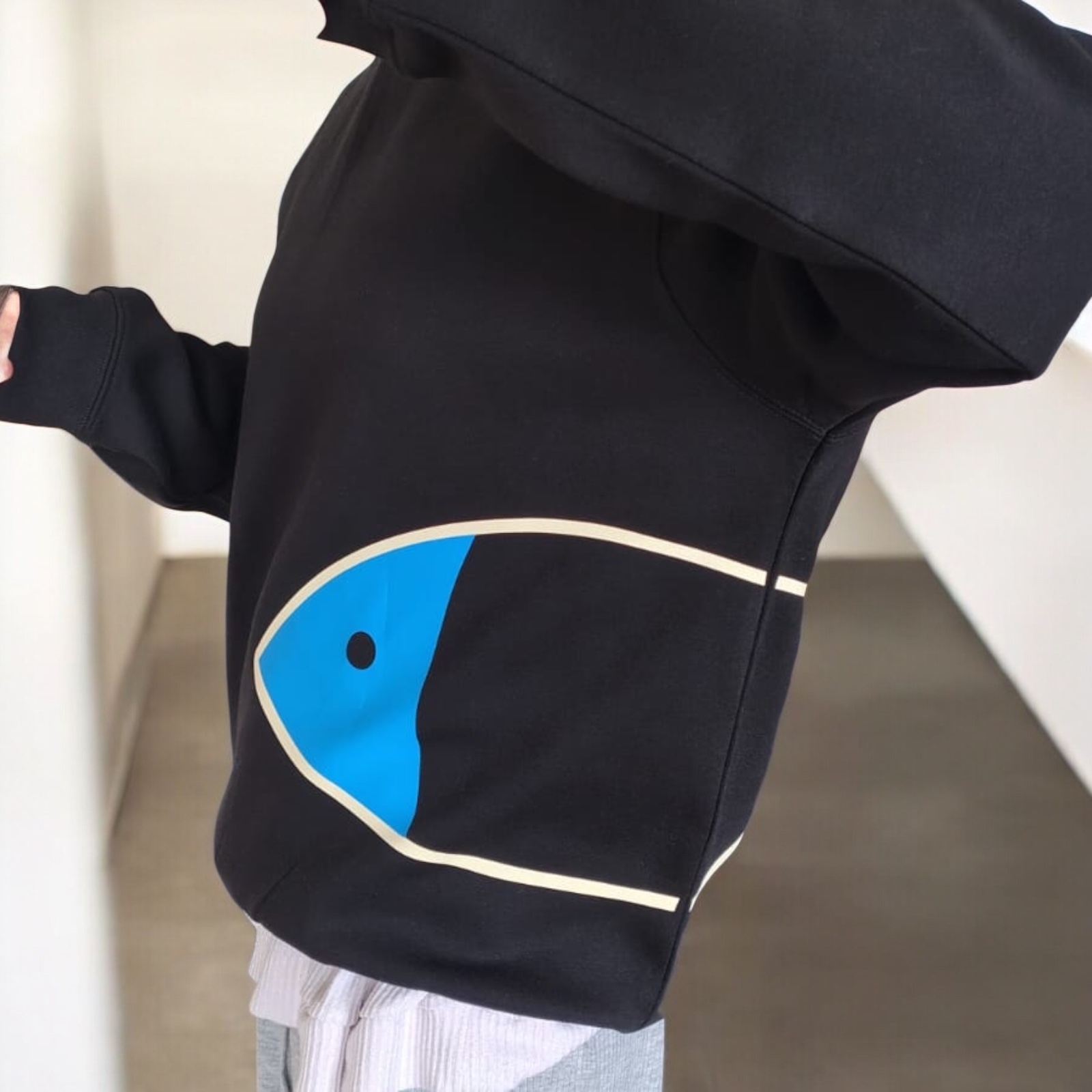 La sudadera Mediopeixe combina comodidad y diseño de autor. Con un alto porcentaje de algodón, presenta el dibujo de medio pez en el frontal y la cola en la espalda, completado con un parche de Os Peixiños de Creare en la manga. Diseño local, inspirado en el mar.