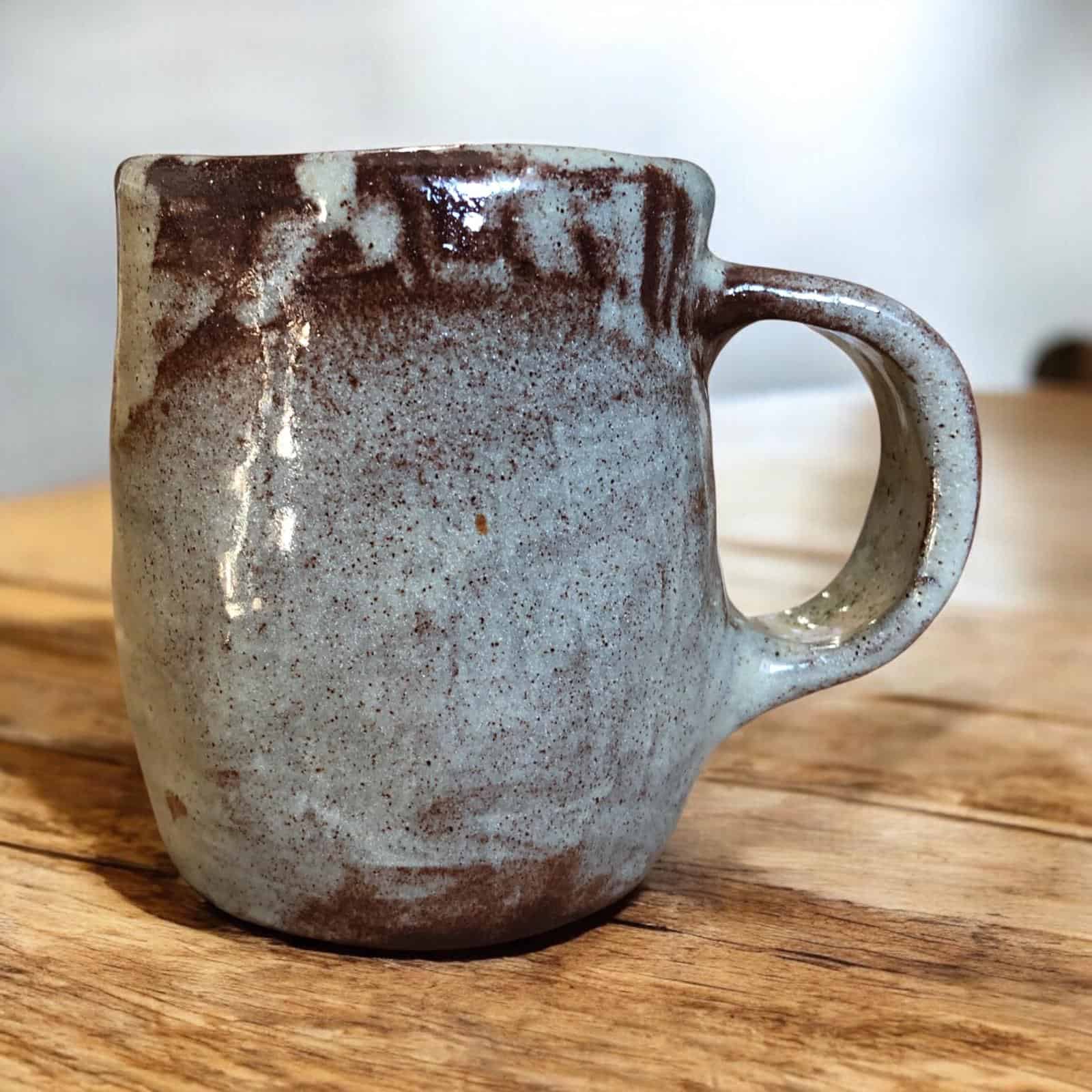 Taza de cerámica modelada a mano, pintada con esmaltes de formulación propia e inspirada en arena de playa.