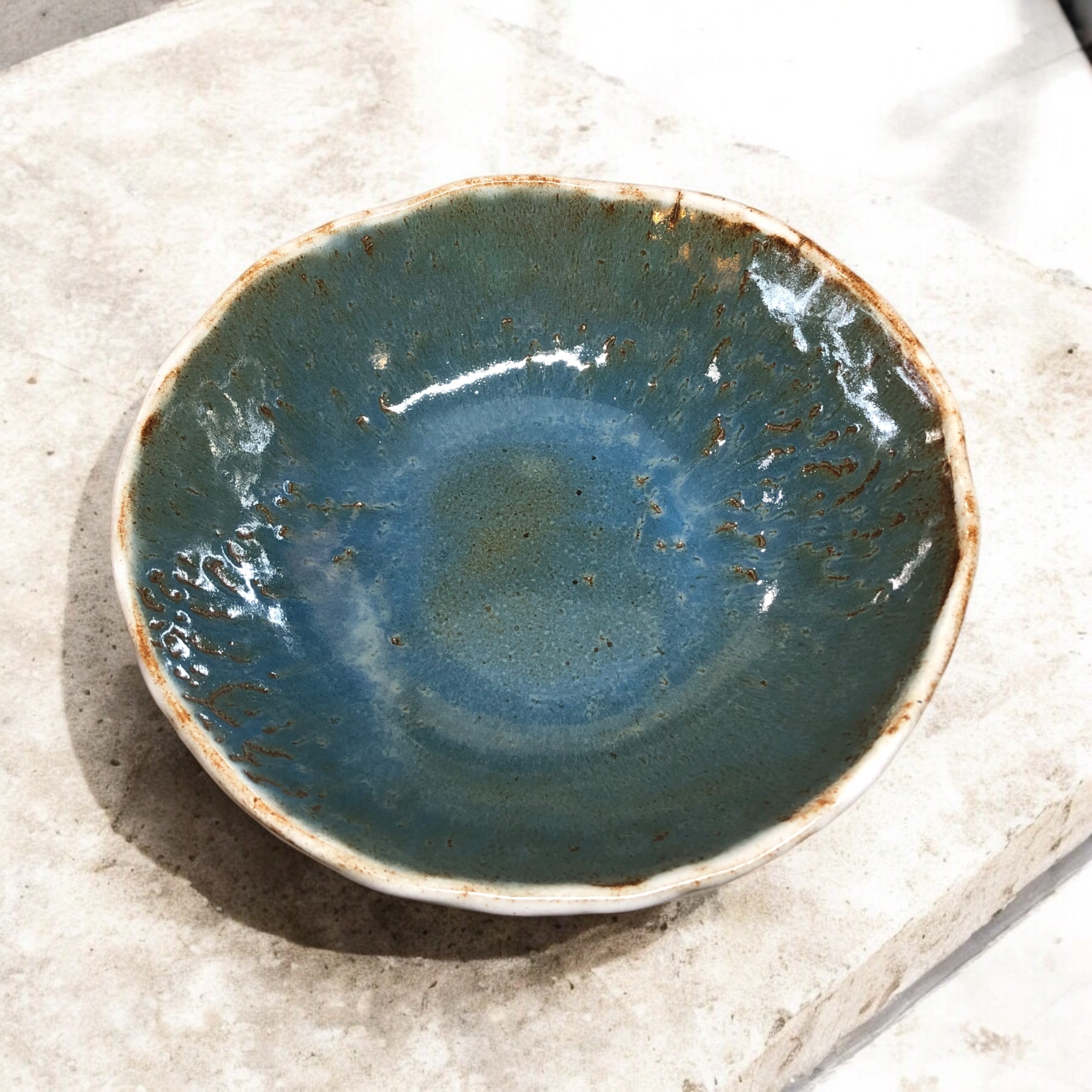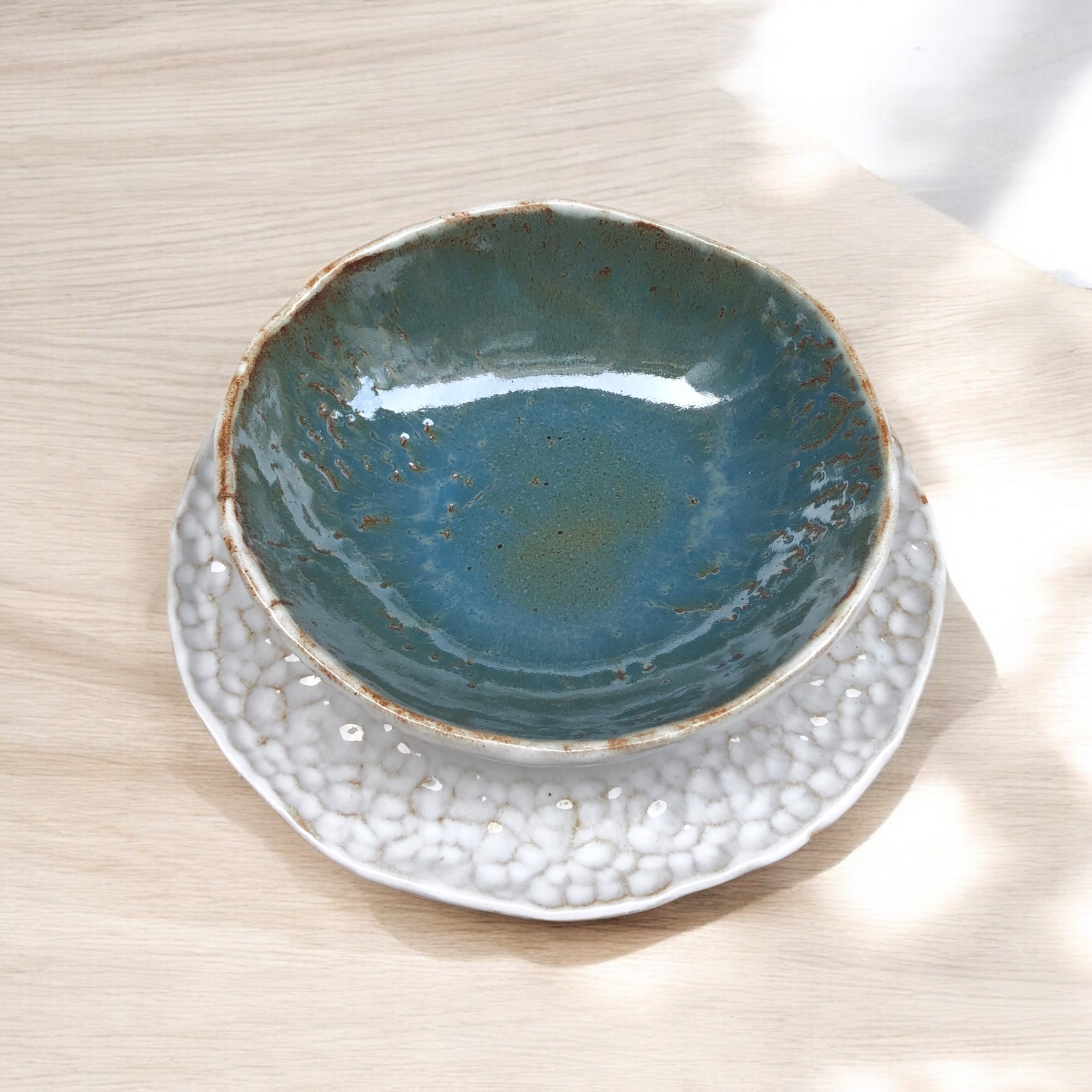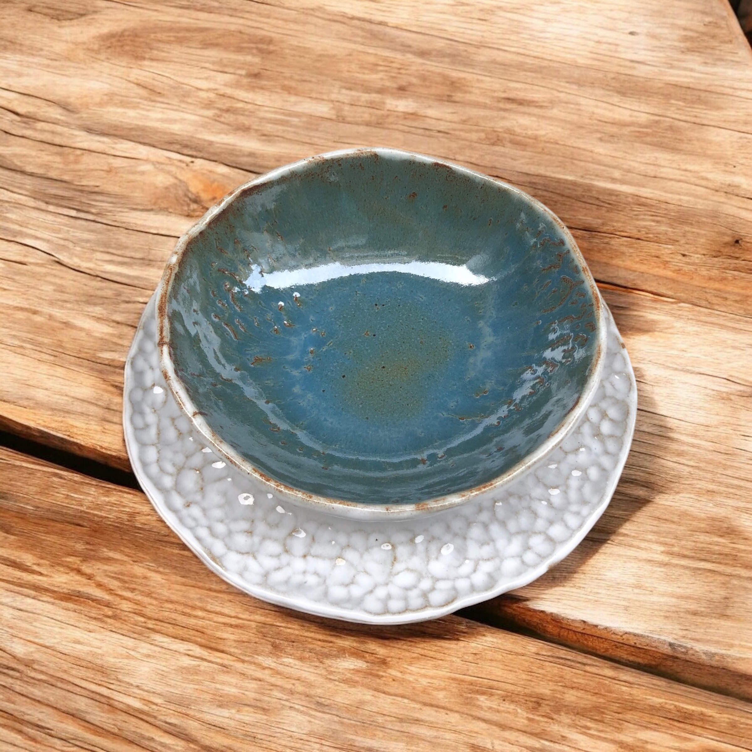 El plato actúa como base luminosa y elegante , mientras que el cuenco introduce un azul intenso con matices terrosos, que aporta profundidad y calidez. Ambos comparten el mismo lenguaje cerámico en el exterior: bordes orgánicos, textura artesanal y esmaltes vivos que reaccionan durante la cocción.